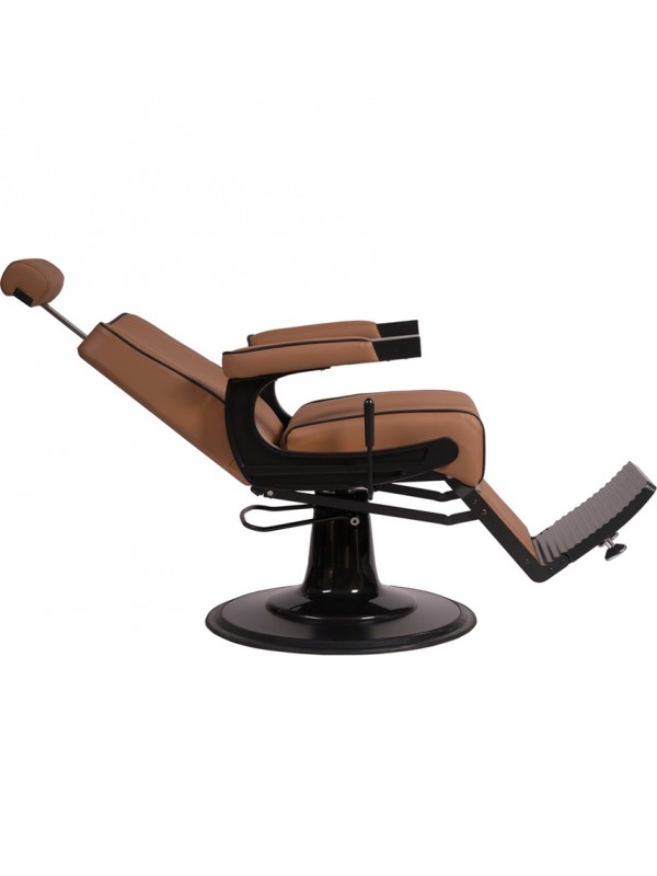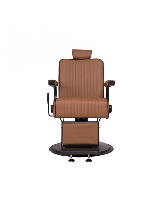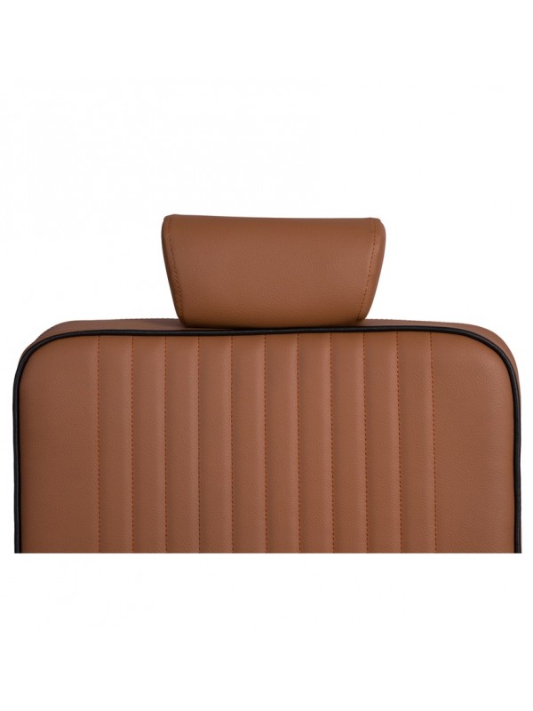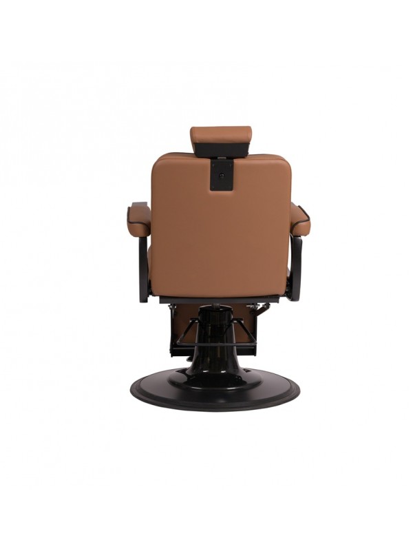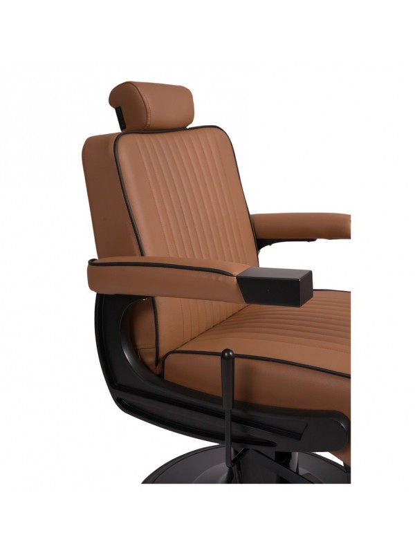 Stevige kappersstoel met een onderstel gemaakt van matzwart afgewerkte aluminium injectiedelen en een metalen binnenstructuur. Ronde voet met matzwarte afwerking en hoogwaardige hydraulische pomp. Zitting van schuimrubber met hoge dichtheid en veren voor maximaal comfort en duurzaamheid. Camelkleurige bekleding met verticale stiksels en zwarte biezen.