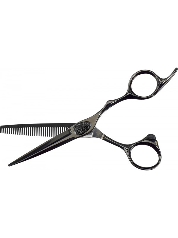 Deze hoogwaardige zwart-glanzende, roestvrij stalen schaar met titanium buitenlaag SUS440C zal altijd trendy zijn. De effileerschaar met 30v-gevormde tanden om zichtbare delen in het haar te vermijden is gecombineerd met een bol snijblad. De vaste vingersteun en offset-hendel garanderen comfort tijdens langdurig gebruik.