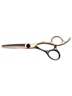 Deze offset-effileerschaar combineert schoonheid en functionaliteit op perfecte wijze. Het hoogwaardige titanium gecoate SUS440C roestvrij staal is gemaakt can ëén helft roségoud en één helft is zwart met een zilver marmereffect. Een zwarte fashion-schroef maakt de look af. Het uitdunblad heeft 30 V-gevromde tanden om zichtbare delen in het haar te vermijden en is gecombineerd met een bol snijblad. De vaste vingersteun enoofset-hendel garanderen comfort tijdens langdurig gebruik.