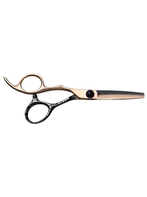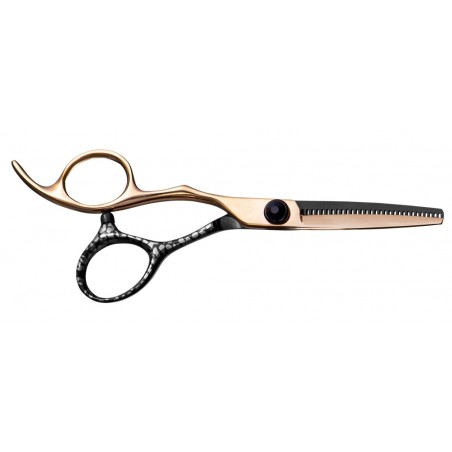 Deze offset-effileerschaar combineert schoonheid en functionaliteit op perfecte wijze. Het hoogwaardige titanium gecoate SUS440C roestvrij staal is gemaakt can ëén helft roségoud en één helft is zwart met een zilver marmereffect. Een zwarte fashion-schroef maakt de look af. Het uitdunblad heeft 30 V-gevromde tanden om zichtbare delen in het haar te vermijden en is gecombineerd met een bol snijblad. De vaste vingersteun enoofset-hendel garanderen comfort tijdens langdurig gebruik.