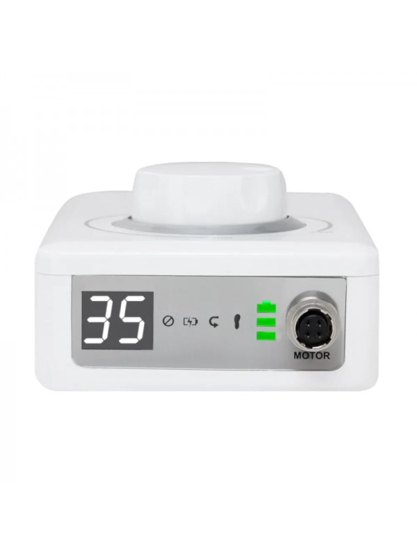 Met een draaiknop kan de snelheid van de kop worden ingesteld op 35.000 omwentelingen per minuut, waardoor deze efficiënt kan worden aangepast aan individuele behoeften en daardoor een breed scala aan behandelingen comfortabel kan worden uitgevoerd. Met handige knoppen aan de zijkanten kun je de besturing eenvoudig omschakelen naar voetaandrijving, de werking van het apparaat stoppen (pauzefunctie) en de draairichting veranderen, waardoor je volledige controle hebt over de freesmachine en de werking ervan eenvoudig kunt aanpassen voor specifieke diensten. LED-indicatoren stellen je in staat om de status van het apparaat te controleren - ze informeren je over de draairichting, batterijstatus, activering van de voetaandrijving en pauze. Het apparaat is uitgerust met een overbelastingsbeveiliging met LED-waarschuwingssignaal, die de motor beschermt tegen oververhitting en zo zorgt voor een grotere operationele veiligheid en het apparaat beschermt tegen schade.