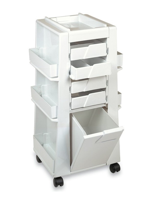 Deze speciale kunststof servicetrolley Cirea voor schoonheidsbehandelingen en ontharing biedt tal van opbergmogelijkheden en is aan 4 kanten te gebruiken.
