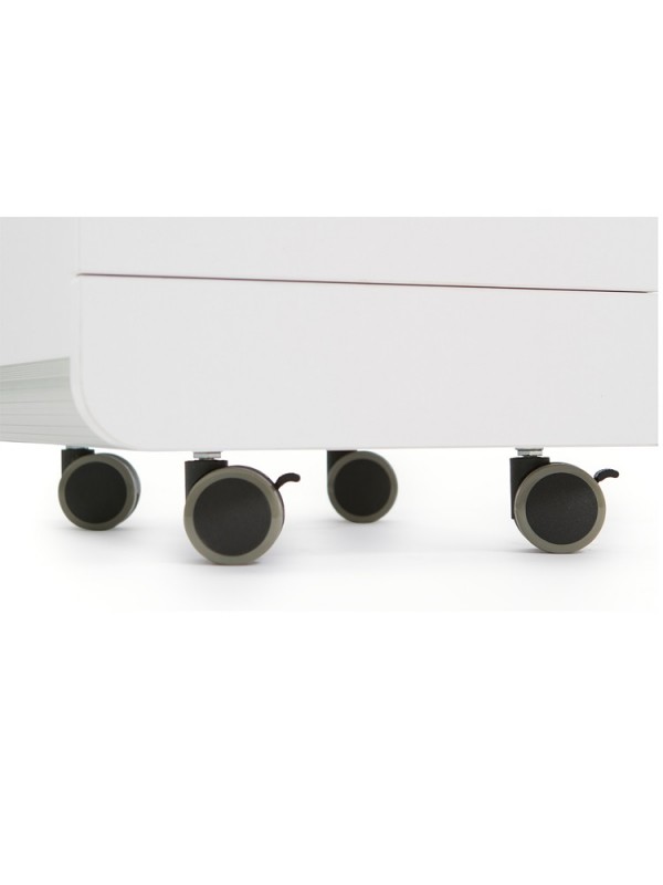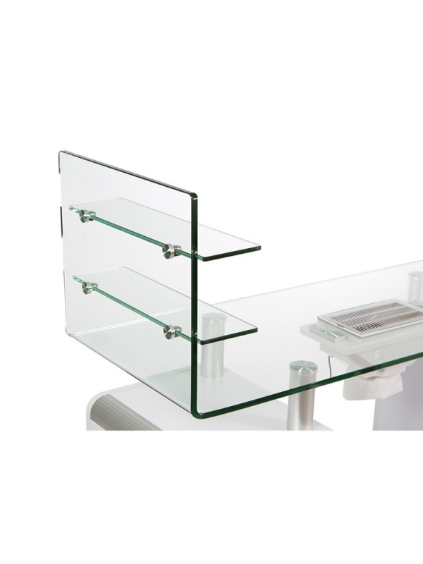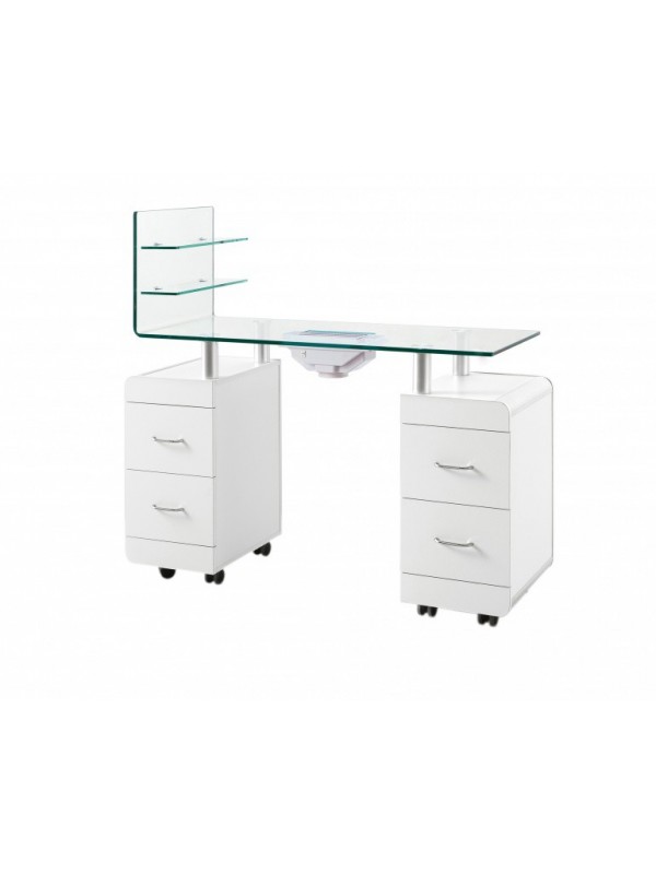 Luxe manicuretafel met gebogen tafelblad in getemperd glas met 2 glazen legbladen. Gemonteerd op 2 kastjes met elk 2 lades en 4 wieltjes. Onder het glazen werkblad, op de 2 kolomkastjes is voldoende plaats voorzien om uw UV / LED lamp(en) te zetten. Er zijn tevens kabelgootjes voorzien, zodat de kabels aan de binnenkant van de kast geborgen zitten.