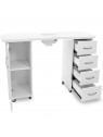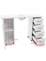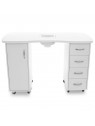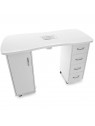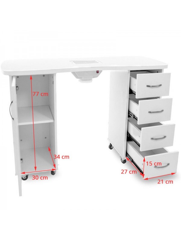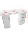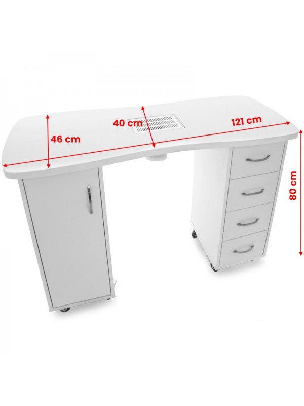 Functionele nageltafel met ingebouwde afzuiging, uiterst elegant en past perfect bij de inrichting van moderne salons. Het bureau heeft een lade, kasten van verschillende afmetingen en een stofafzuiging. Het meubilair is stabiel en gemakkelijk door de kamer te verplaatsen, zelfs als het beladen is.
