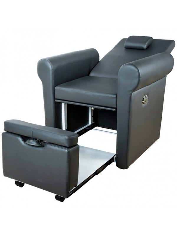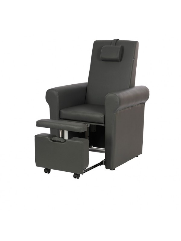 Comfortabele en elegante SPA pedicure fauteuil met hoogwaardige grijze PU-bekleding. De rugleuning is in een van hoek 13-70 graden verstelbaar door middel van een gasveer. Deze SPA pedicurestoel is uitgerust met een verschuifbaar compartiment voor het plaatsen van een pedicure voetbad of schaal (niet inbegrepen). Verstelbare voetsteun.