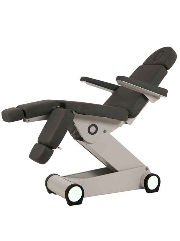 De Behandelstoel Blight voor pedicure behandelingen is een Luxe Behandelstoel van Weelko Barcelona die opvalt door zijn innovatief design. De stoel is uitgerust met 3 motoren die de hoogte, rugleuning en zitting inclinatie regelen. De Blight beschikt tevens over de befaamde Trendelenburg stand, de Trendelenburg stand in deze behandelstoel Blight maakt een uitgebreide gezichts- & decolleté behandeling zeer comfortabel daar het niet gewenst is voor uw cliënt om langer dan 15 minuten kaars recht op een behandelstoel te liggen, de Trendelenburg stand op de Blight behandelstoel maakt het mogelijk om het zitvlak naar achteren te hellen zodat het einde van het zitvlak de knieholten van uw cliënt opvullen en dit met het rugdeel 11 graden omhoog maakt het ligcomfort van uw cliënt tot een aangenaam hoogte punt. De beensteunen zijn in iedere gewenste stand verstelbaar door middel van een gasveer. Verder beschikt deze pedicurestoel over verstelbare en afneembare armleuningen en hoofdsteun. Zeer stabiele stalen structuur met wit LED-licht ingebouwd in de basis (4 steunen van onderstel ). Deze behandelstoel Blight heeft een grijze PU bekleding van hoge kwaliteit.
