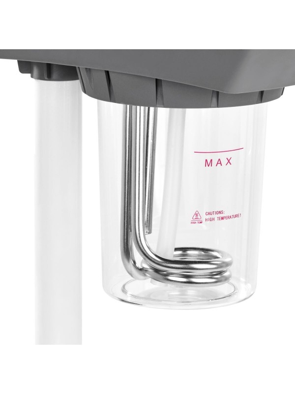 De omhuizing is gemaakt van kunststof in wittinten, waardoor het apparaat makkelijk schoon te houden is . Het statief is uitgerust met een eenvoudige hoogteverstelling in het bereik van 78-95 cm , waarmee u de apparatuur op het juiste niveau kunt instellen om het werkcomfort van de persoon die de procedure uitvoert te garanderen. Het mondstuk van de stomer kan worden gedraaid , wat het bereik van mogelijke instellingen vergroot. De viersterrenbasis met rubberen wielen verbetert de mobiliteit , waardoor het gemakkelijker wordt om het apparaat vrij te verplaatsen.