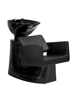 Compacte shampoo-wasunit, ideaal voor kappers- en schoonheidssalons. Voorzien van een stevige polyester structuur met glasvezel. Ergonomisch ontwerp voor zowel de professional als de gebruiker. Hij heeft een zwarte keramische kantelbare wastafel voor comfortabel wassen, voorzien van hoogwaardige polyamide kraan en een RVS onderstel. De zitting heeft twee standen en is bekleed met hoogwaardige zwarte stof.